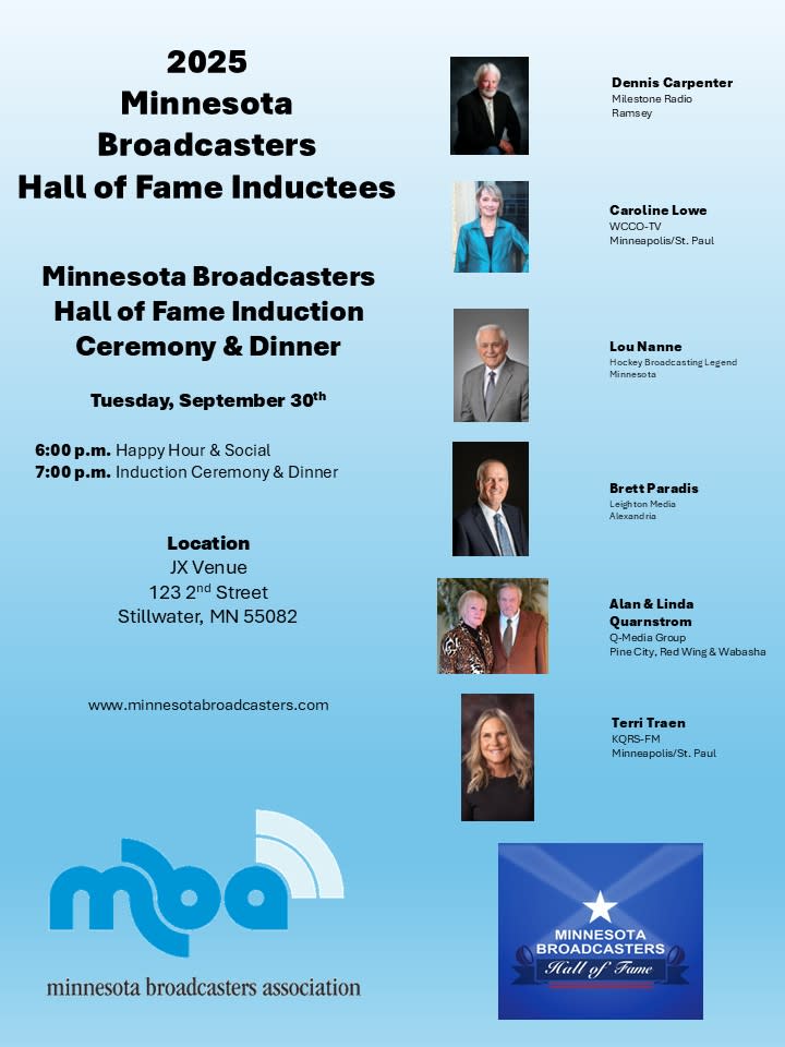 7:00 p.m. Minnesota Broadcasters Hall of Fame Induction Ceremony and Dinner