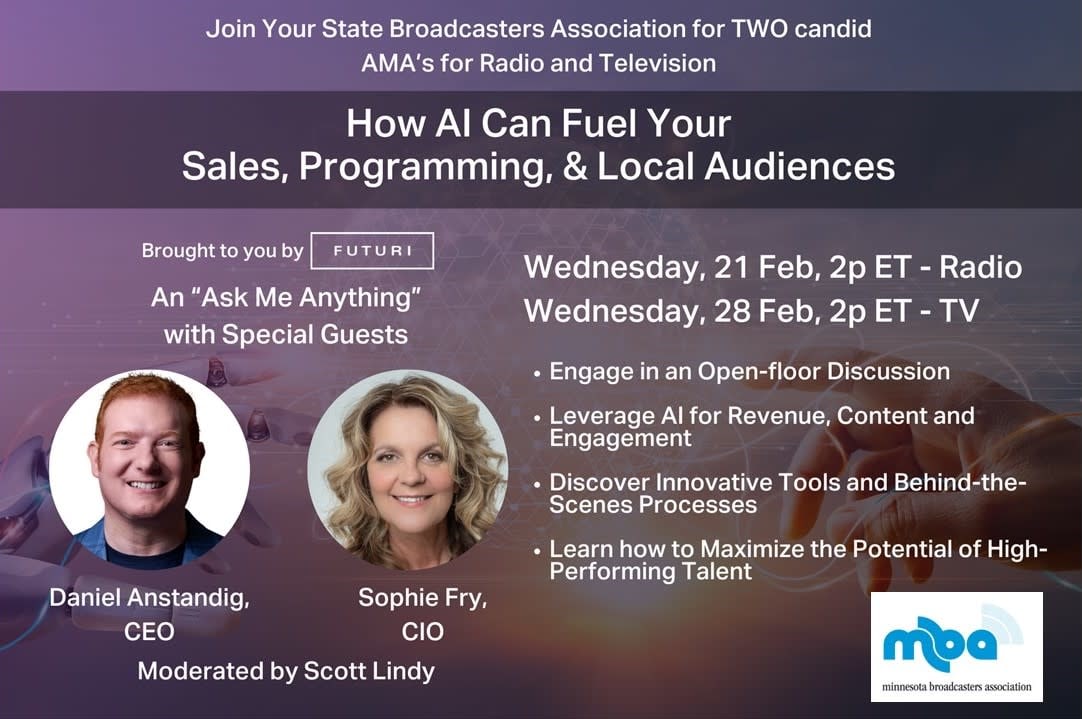 Join us for an exclusive two-part 'Ask Me Anything' (AMA) series with Futuri executives Daniel Anstandig (CEO) and Sophie Fry (CIO), as they provide insights into the current state of AI in media, setting the stage for an engaging open-floor discussion. Gain practical knowledge on leveraging AI to diversify revenue streams, streamline content repurposing, and strengthen community engagement.
